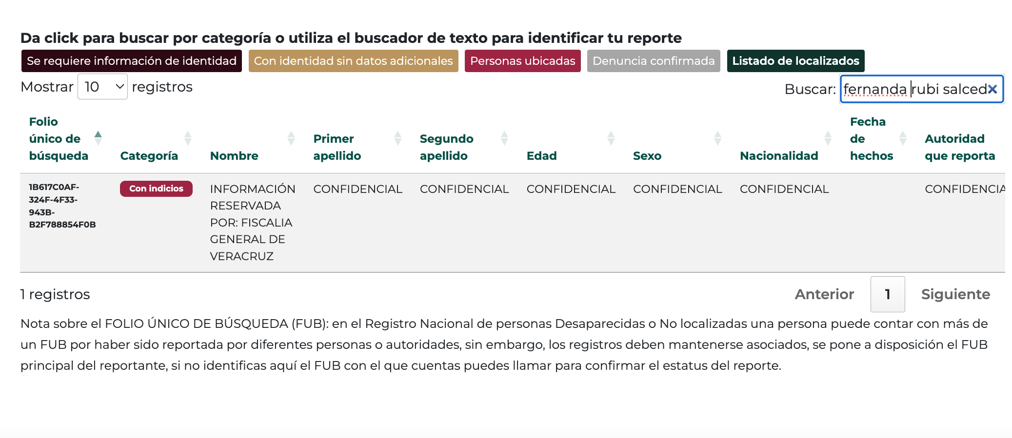 Al buscar su nombre, junto al folio único de búsqueda se lee únicamente: “Información reservada por Fiscalía General de Veracruz”, y el resto de datos solo incluyen la palabra “Confidencial”. La buscadora asegura que ella no pidió que se ocultara la información sobre su hija y tampoco sabía, hasta el momento en que este medio la contactó, que las autoridades federales tenían indicios sobre Fernanda Rubí.