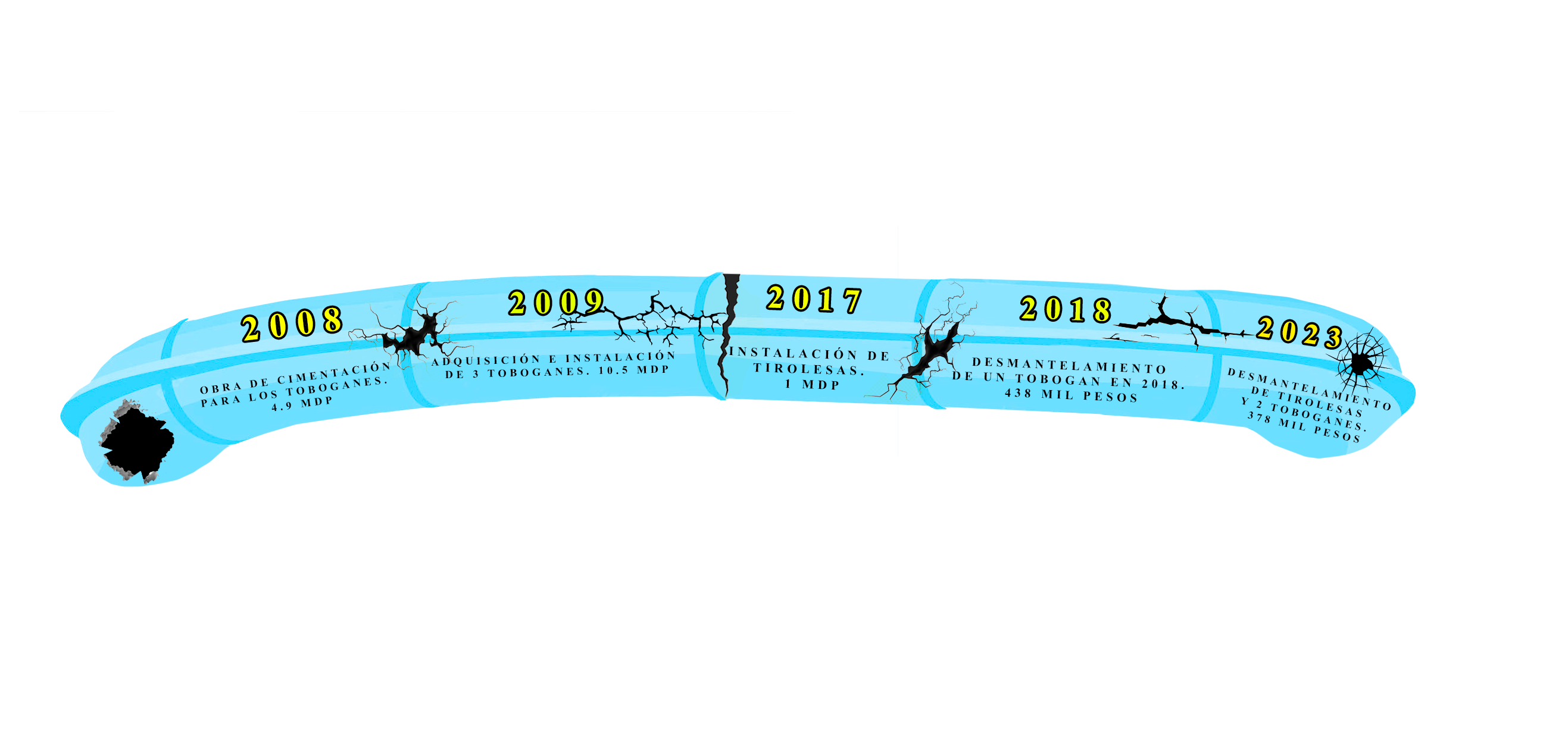 La misma empresa fue la encargada de la obra de Cimentación para Toboganes en el Parque Acuático, con un costo de 4 millones 989 mil 977 pesos, cantidad que se sumó a los 10.5 mdp que costó la adquisición y colocación de los toboganes, para un gasto total de alrededor de 15 mdp.