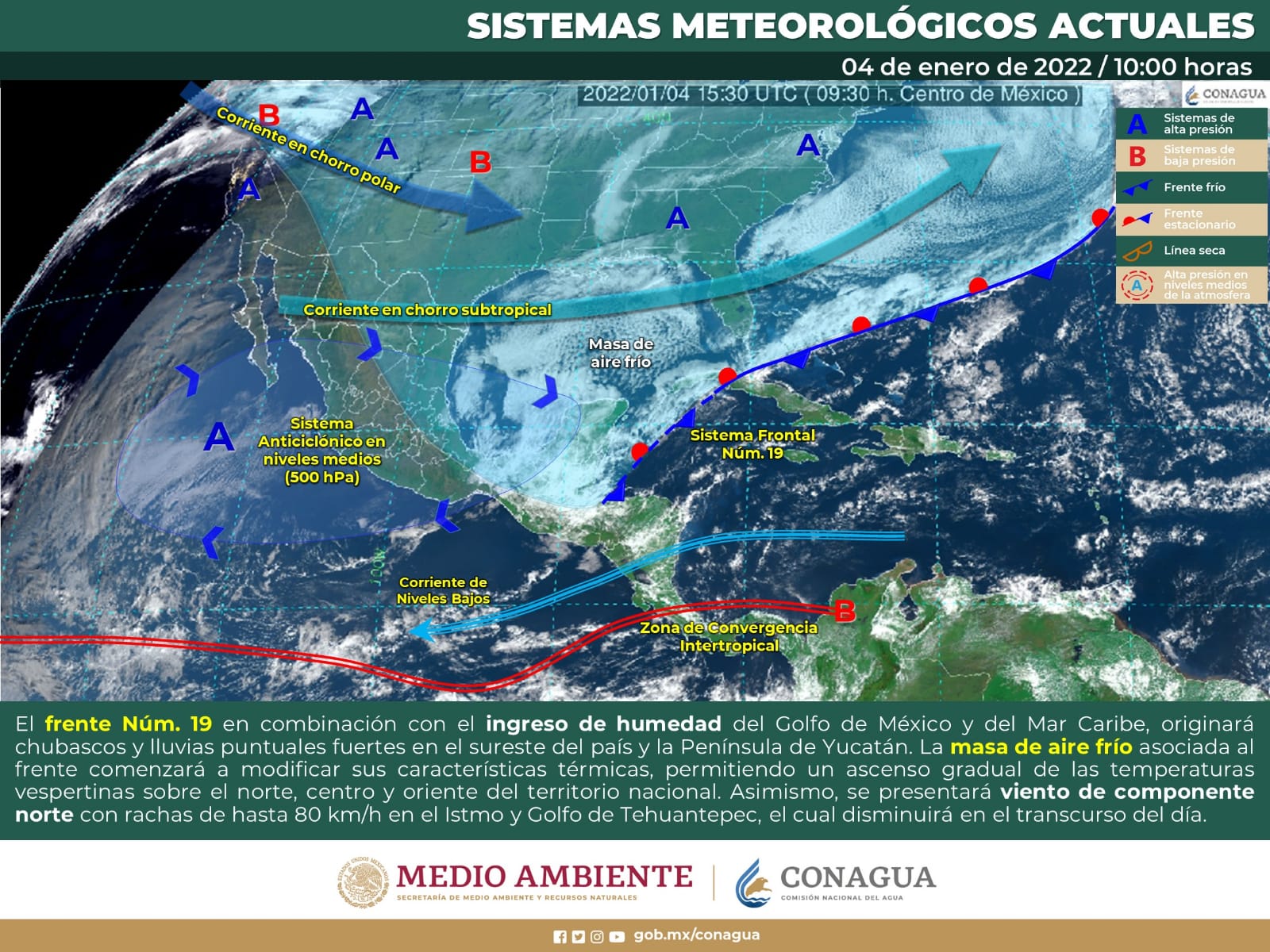 El jueves el nuevo frente frío ingresará en el norte y noreste de México y recorrerá el noreste y oriente del país en el transcurso del viernes provocando lluvias e intervalos de chubascos en el sureste del territorio nacional.